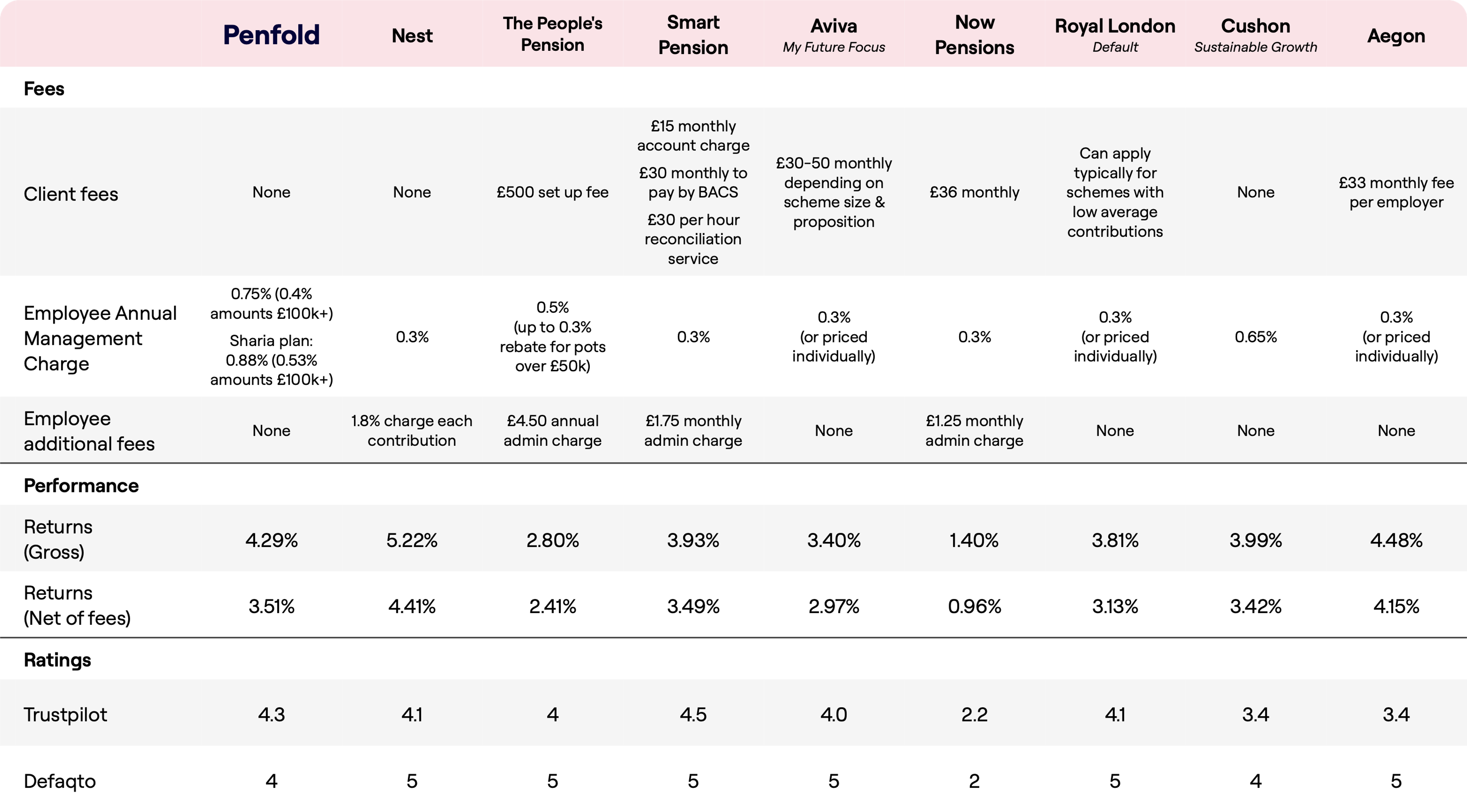 This comparison highlights Penfold’s strong position for businesses. With top-tier Defaqto and Trustpilot ratings, Penfold goes above and beyond by providing features like managed onboarding, compliance support, and payroll integrations at no cost to businesses.